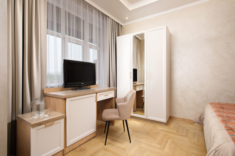 Площадь 25,6 м2. Номера находятся на 2-6 этажах корпуса №1. Номер для комфортного размещения 1 человека на основном месте.