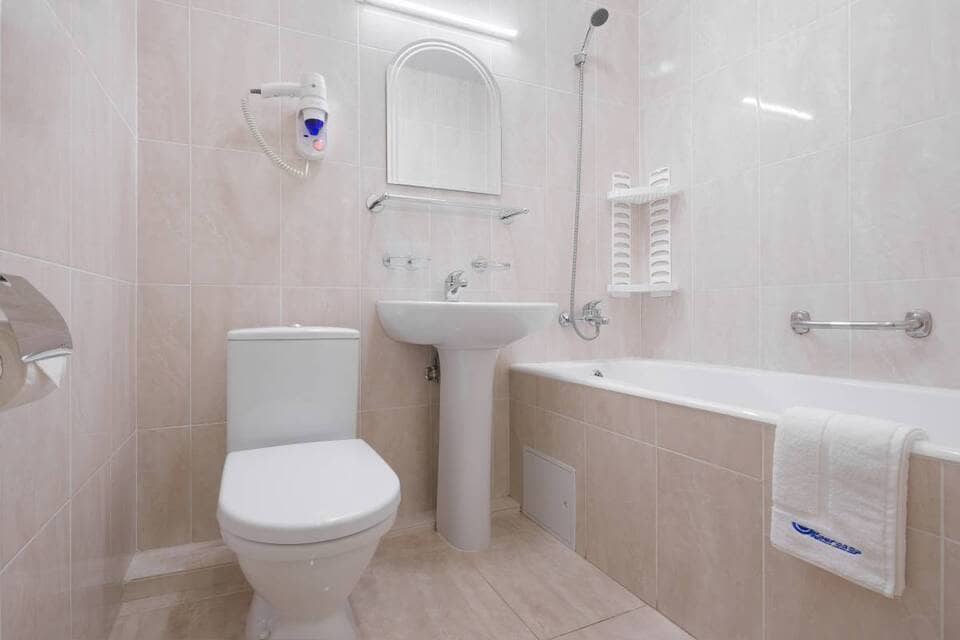 • Ванная комната: ванна, раковина для умывания, унитаз, фен для сушки волос, халат, тапочки, туалетный набор (шампунь, гель для душа, мыло, шапочка для душа, швейный набор).